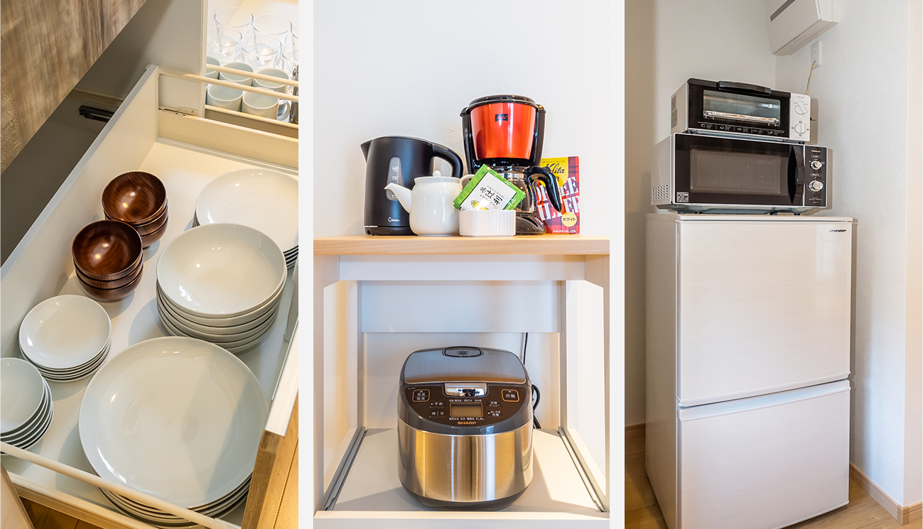 炊飯器、トースター、電子レンジ、コーヒーメーカー、湯沸かしポット、冷蔵庫、包丁、食器、フライ返し、おたま、トング、菜箸、まな板、片手鍋、フライパン×2、ふきん、ラップ、食器洗剤、スポンジ |